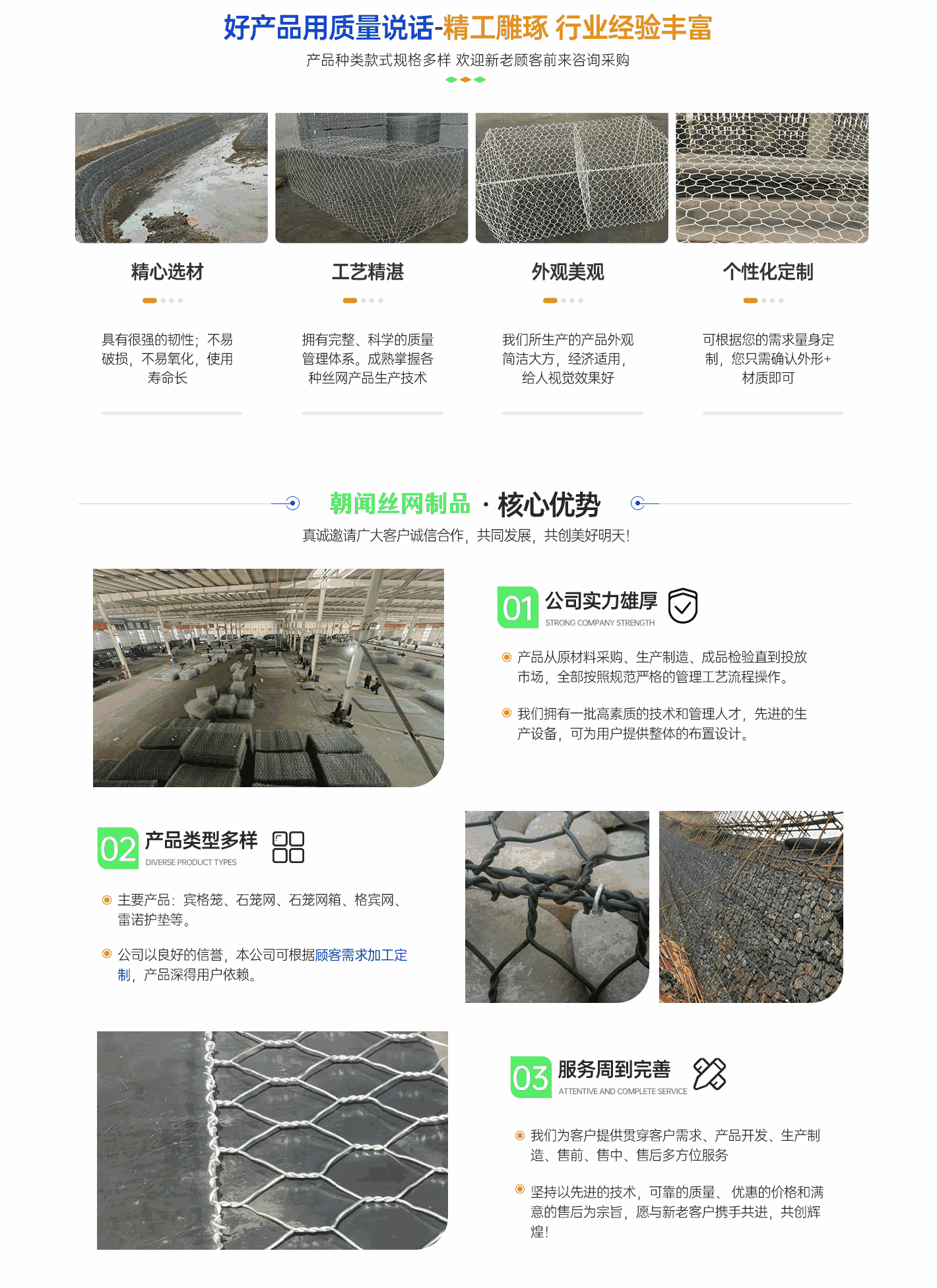 深州市朝聞絲網(wǎng)制品有限公司擁有“中國絲網(wǎng)之鄉(xiāng)”美譽的河北省致力于生產(chǎn)銷售格賓網(wǎng),雷諾護墊,景觀石籠網(wǎng),邊坡防護網(wǎng),綠濱墊,固濱籠的廠家,規(guī)格多種多樣。 我廠堅持技術(shù)創(chuàng)新、科學(xué)管理、誠信經(jīng)營,注重引進(jìn)新型生產(chǎn)技術(shù)設(shè)備,推行標(biāo)準(zhǔn)化生產(chǎn),采用質(zhì)量管理體系,從原材料采購、生產(chǎn)管理、產(chǎn)品檢測等關(guān)鍵環(huán)節(jié)嚴(yán)格把關(guān),確保了產(chǎn)品質(zhì)量,贏得了客戶的信賴。我公司秉承“誠信、務(wù)實、高效”的企業(yè)宗旨,真誠希望與世界各地客戶互惠互利,共創(chuàng)美好未來!多年來"以誠立廠","以質(zhì)興業(yè)"。 憑借過硬的質(zhì)量、良好的信譽、優(yōu)質(zhì)的服務(wù)、合理的價格不斷拓展市場,誠摯的希望在平等互利,坦誠相待的基礎(chǔ)上與國內(nèi)外客戶長期合作!...